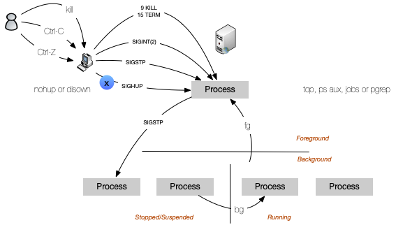 Ctrl-Z → send a SIGSTP signal to the process, and push the process back into the backgroud(job), then the process will be stopped.